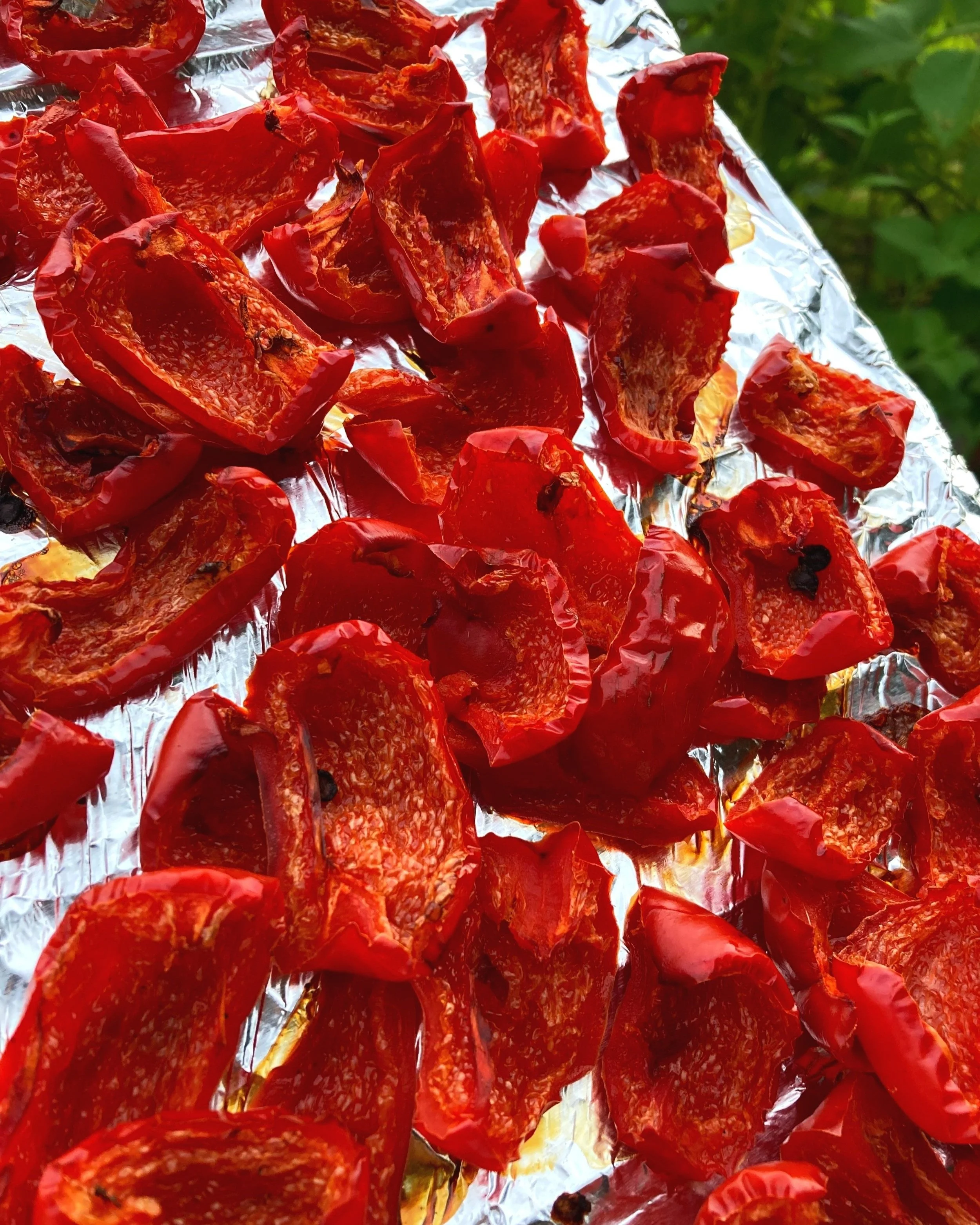 When the water is cooked off and the peppers are thoroughly cooked, softened, and lightly caramelized, remove from heat and cool for 20 minutes.