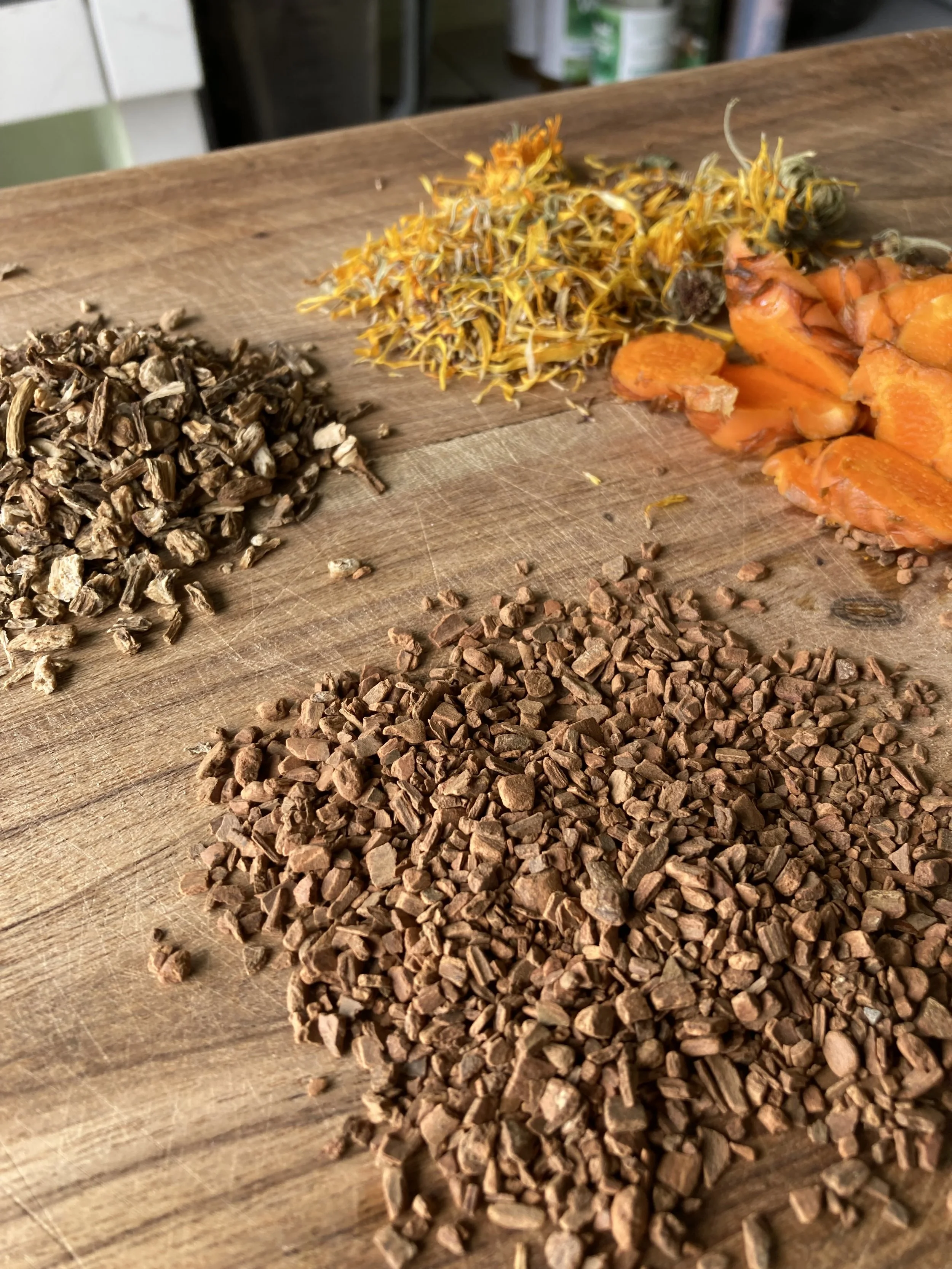 First, a decoction to extract the medicinal constituents from the angelica root, cinnamon, and turmeric.