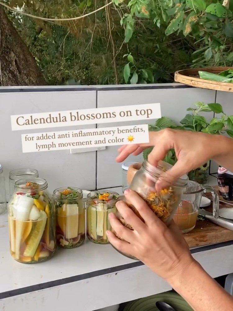 Pack cucumbers, garlic, gotu kola oregano (or whatever ingredients you choose) evenly into two jars.